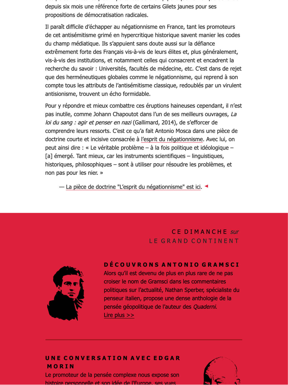 Unser damals erstes Projekt, das jeden Samstagvormittag verschickt wird, ist der Sonntagsbrief, der die zeitgenössischen politischen und kulturellen Auffassungen beleuchtet und die wichtigsten Themen der europäischen Debatte durch das Prisma der Arbeit des Grand Continents reflektiert.