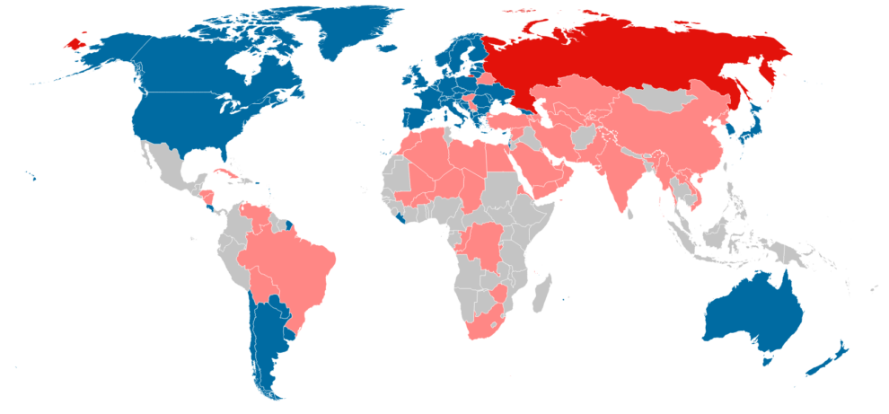 El jueves 21 de marzo a las 19:00 en Madrid, según nuestros cálculos, los gobiernos que han expresado su felicitación al Kremlin abarcan una población de 4.300 millones de personas (el 53% de la población mundial), frente a sólo 1.300 millones en el caso de los países que han condenado el proceso electoral -por supuesto, la postura de sus gobiernos no representa necesariamente la de sus habitantes-.