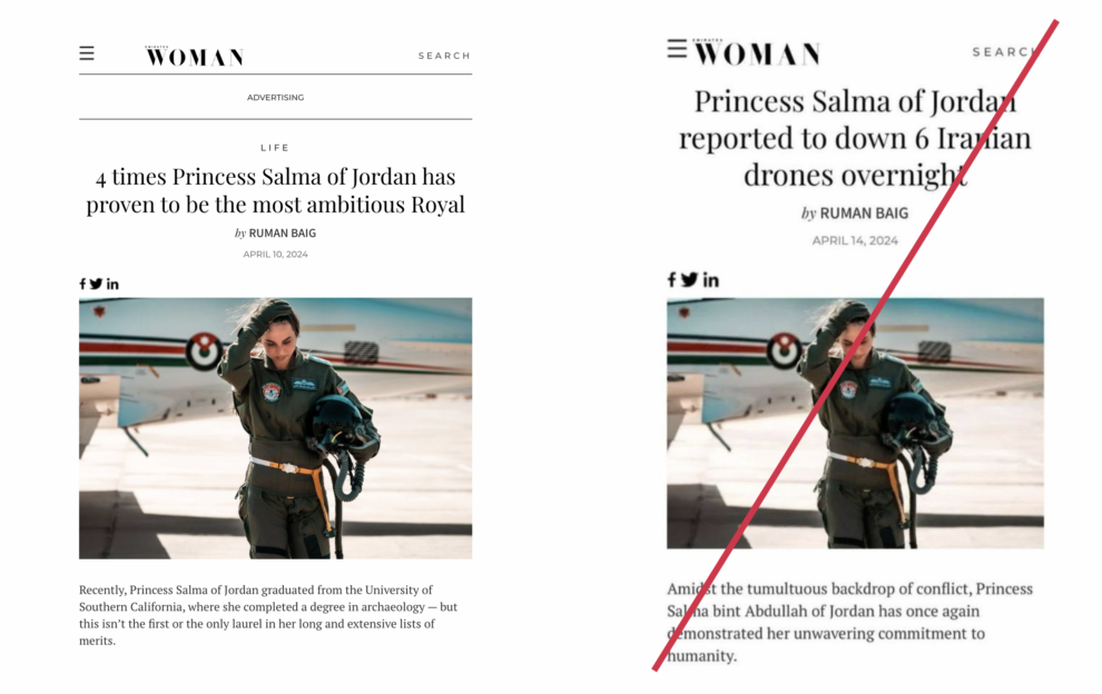 - En la noche del 13 al 14 de abril, pocas horas después de la noticia de que cazas y sistemas estadounidenses y jordanos (radares, sistemas de misiles tierra-aire) iban a apuntar y luego neutralizar drones iraníes que transitaban por el territorio del reino para que no alcanzaran Israel, varias cuentas empezaron a compartir una serie de imágenes que distorsionaban un artículo de la revista Emirates Woman (a la izquierda la versión original 1, a la derecha la versión falsa).