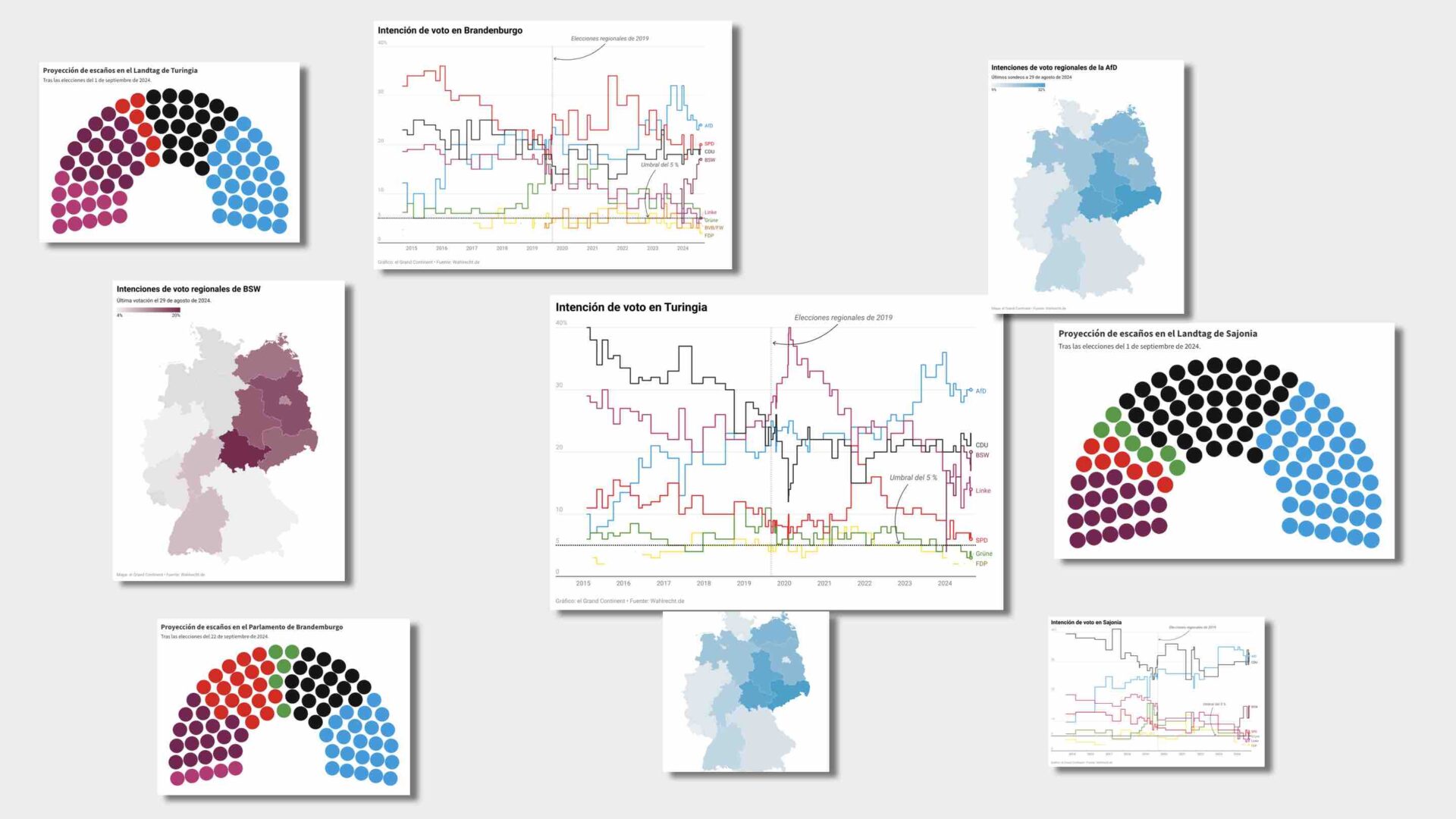 En Brandeburgo, la situación es ligeramente diferente: el SPD obtiene actualmente alrededor del 20%, los Verdes en torno al 5% y el FDP un 2%. La región, bastión socialdemócrata desde la caída del Muro de Berlín, sigue liderada por el ministro-presidente socialdemócrata Dietmar Woidke. El resultado de la AfD es ligeramente inferior aquí que en los otros dos Länder, y el SPD se beneficia de la gran popularidad del presidente regional saliente. Sin embargo, el partido podría perder su primer puesto en favor de la AfD el 22 de septiembre. En tal escenario, Woidke ya ha anunciado que no desea encabezar la próxima coalición.