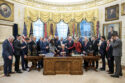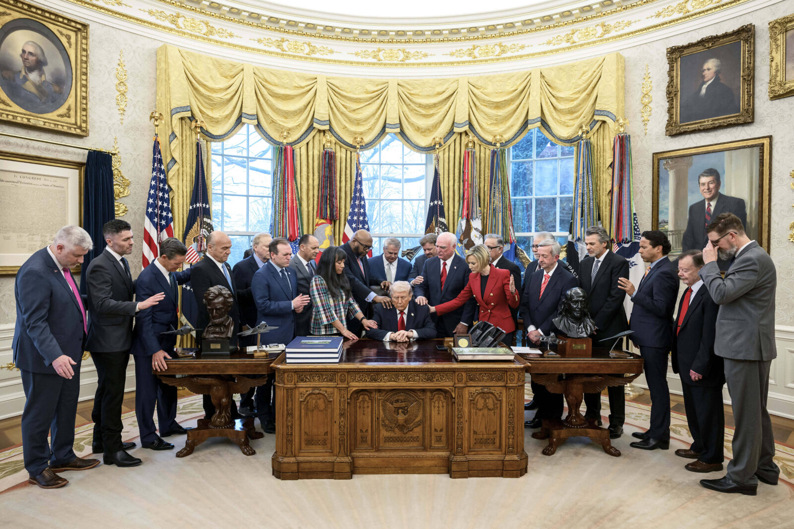 O hace un año, el 19 de marzo de 2025. En esa ocasión, el presidente estadounidense recibió a 17 pastores evangélicos en el Despacho Oval para que oraran por él y le impusieran las manos. La oración central, pronunciada por Samuel Rodríguez, decía: «Oramos por el presidente Trump. Tú lo has designado, tú lo has nombrado, tú lo has ungido para un tiempo como este. Cúbrelo con la sangre de Jesús».