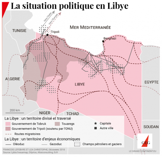 - L’entrée de la France dans les affaires de la Cyrénaïque a été favorisée par deux facteurs : l’isolement diplomatique libyen, qui a ouvert une nouvelle frontière commerciale pour Paris, et la présidence Sarkozy, qui face à une politique “officiellement” tripolitaine, a intensifié les relations avec certaines des réalités présentes entre Tobrouk et Benghazi. La question pétrolière y est fortement liée, Total agissant comme un vecteur géopolitique pour la France dans le contexte libyen.