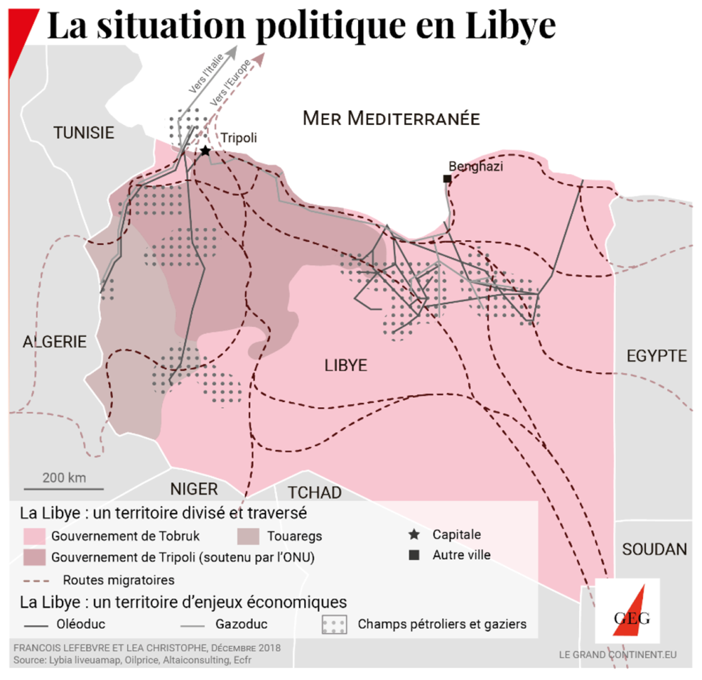 L’arrivée sur les lieux de Kadhafi, en 1969, a considérablement transformé cette situation, conduisant à un centralisme d’État à part entière, essayant de rejeter tout tribalisme et toute division régionale. La rhétorique de Kadhafi, exprimée par le “Livre Vert”, est fondée sur un panarabisme reposant sur une triple appartenance : au monde arabe, au monde musulman et au continent africain. L’appartenance à l’État libyen, avec son centre à Tripoli, devait aller au-delà de toute division, au nom de l’union des peuples arabes (reprenant la pensée de Gamal Abdel Nasser). Dans la période de l’isolationnisme diplomatique libyen, dans les années 90, Kadhafi a trouvé un moteur de légitimité dans son appartenance au continent africain, en esquissant la réforme de l’Organisation de l’unité africaine (Oua). Ces canaux de consensus ont cristallisé la question intestinale des réalités régionales libyennes. La diplomatie régionale s’est déplacée pour militariser l’opposition dans les régions de l’Est et du Sud, où Fezzan a été témoin d’une présence pressante du Tchad, adversaire de Kadhafi et pilier pro américain dans la région, tandis que la Cyrénaïque a subi un fort interventionnisme égyptien et des Émirats, soutenu par la France, qui entre-temps a pris le rôle de Londres (1).
