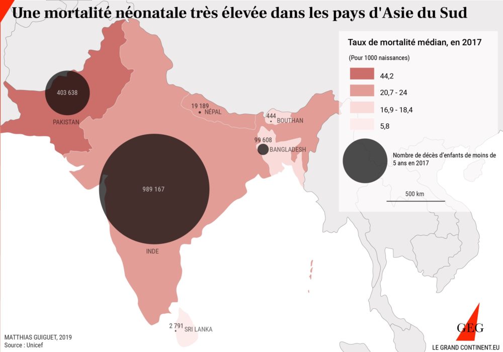La survie des nourrissons n’est pas pour autant assurée du fait d’un faible niveau sanitaire général. En 2018, un million de nouveaux nés n’ont pas dépassé le premier mois d’existence 2. En nombres absolus, au niveau mondial, la part de l’Asie du Sud est comparable à celle de l’Afrique subsaharienne pour le nombre de décès de nourrissons.