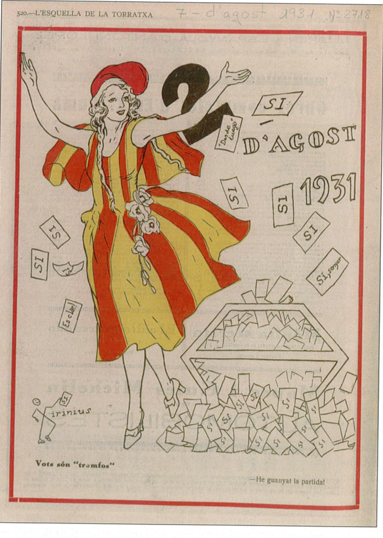 L’année 1931 marque la levée de la chape de plomb qui pesait sur la presse. Des élections locales voient le nombres de députés républicains prendre le dessus sur les monarchistes, ce qui amène le roi à renoncer au trône. En avril 1931, on déclare dans toutes les villes d’Espagne la République, et en particulier à Barcelone, une République Catalane dans une fédération des peuples ibériques. Après quelques tractations, cette déclaration débouche sur l’approbation par référendum en août 1931 du statut d’une entité politique catalane autonome, dont le gouvernement est nommé Generalitat, au sein de la République.