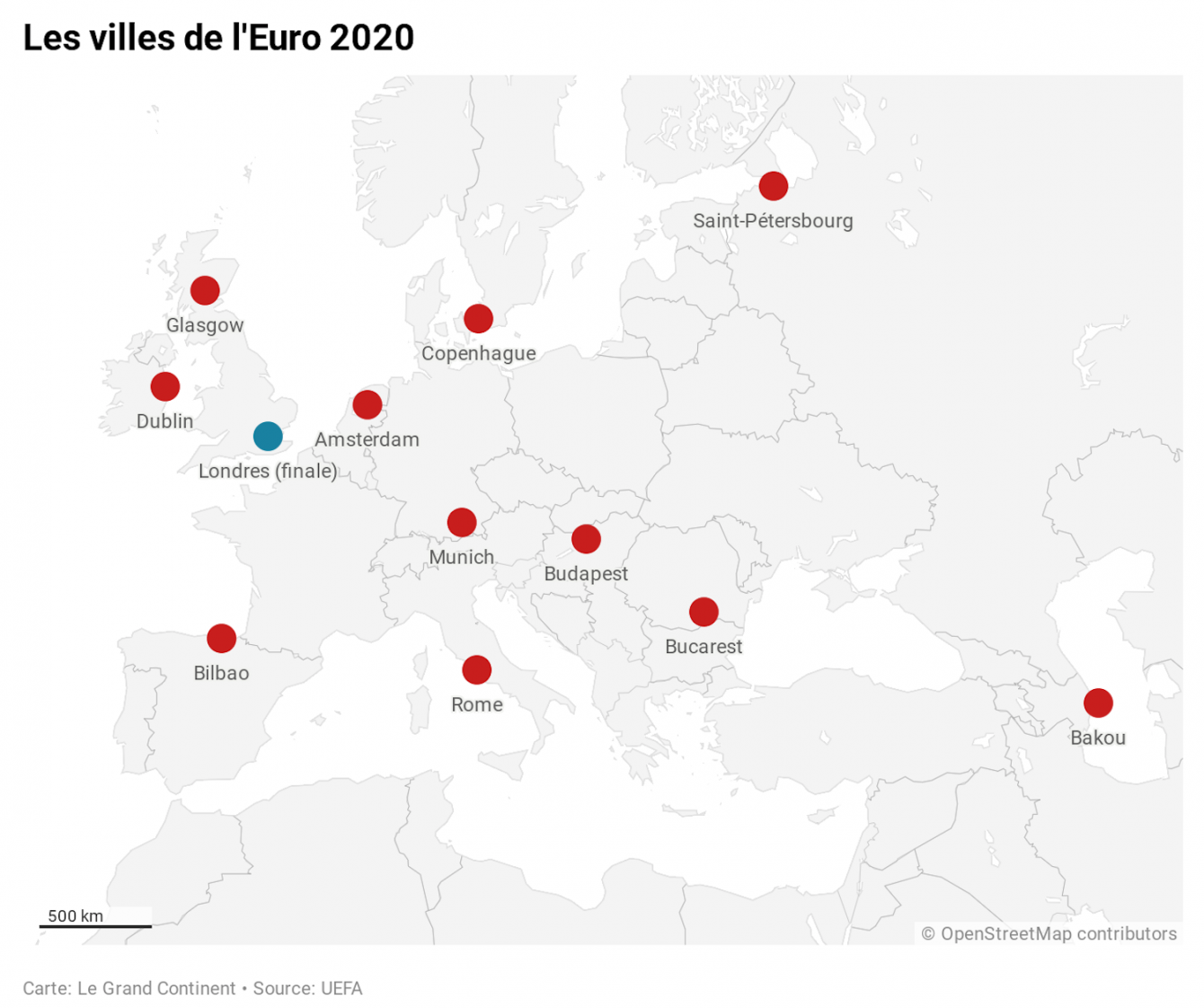 - L’Euro 2020 de football sera résolument urbain : il se déroulera du 12 juin au 12 juillet dans 12 villes européennes issues de 12 États européens. Au-delà des références religieuses (et des hommes en colère), ce choix montre aussi l’accent mis sur une Europe des villes. 1