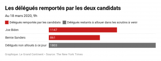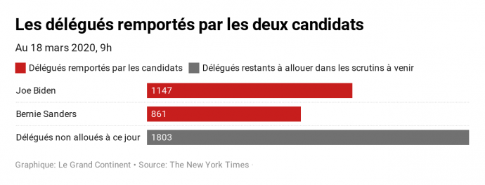 - Face-à-face entre Joe Biden et Bernie Sanders : le retrait des candidatures des principaux candidats avait déjà marqué un tournant favorable à Biden – officiellement soutenu par Michael Bloomberg, Peter Buttigieg et Amy Klobuchar. Après cette étape, Biden et Sanders se disputeront encore 1803 délégués. Pour gagner la majorité des délégués et, ainsi, la nomination, ils doivent obtenir au moins 1991 délégués. 2