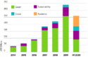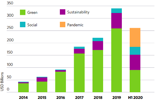 Durant la pandémie de COVID-19, la finance durable poursuit son développement alors que beaucoup défendent une surperformance des fonds ESG par rapport au marché. Cette tendance est soutenue par les émissions de dette durable (figure 1), et la pandémie a d’ailleurs opéré un changement important dans le mix jusqu’alors dominé par les obligations vertes. En effet de nombreux émetteurs ont eu recours à des obligations sociales ou des « pandemic bonds » pour financer les dépenses liées à la situation sanitaire et son impact sur l’économie.