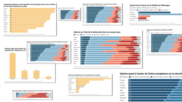 La France se révèle ainsi l’un des pays les plus sceptiques parmi les 14 couverts par l’étude, puisque seules les personnes interrogées en Allemagne ont exprimé un soutien encore plus faible (45 % des Allemands sont en faveur de l’entrée de l’Ukraine dans l’OTAN). Loin du désaccord politique entre Berlin et Paris, les résultats du sondage mettent en lumière une convergence des perceptions entre les deux populations. À l’inverse, les réponses au Portugal (78 % en faveur de l’entrée de l’Ukraine dans l’OTAN, et 81 % dans l’Union), en Lituanie (76 % et 77 %) ou en Pologne (71 % et 72 %) révèlent un soutien populaire important dans plusieurs pays européens.