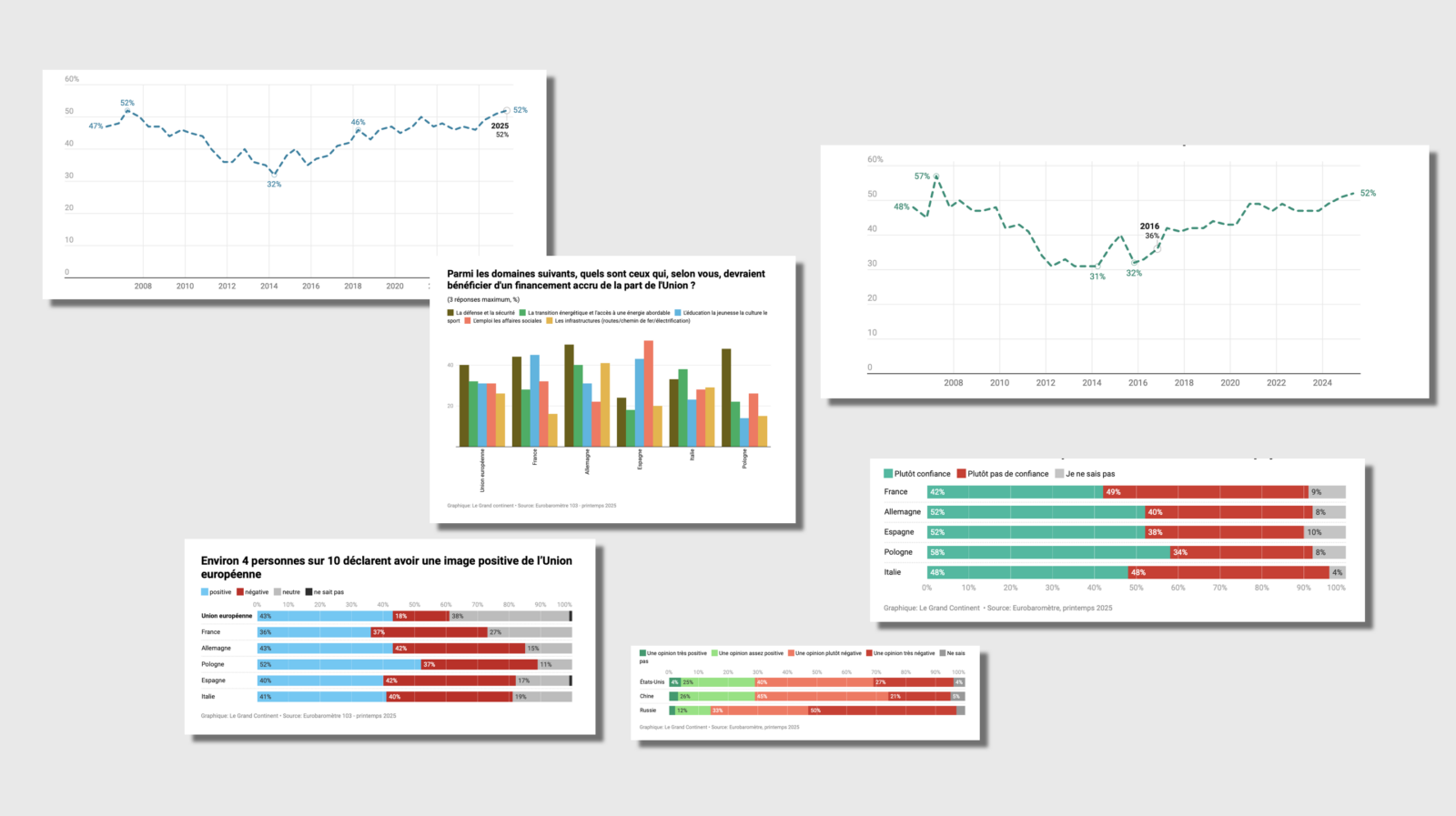 - 43 % des Européens déclarent avoir une image positive de l’Union (36 % en France, 41 % en Italie, 40 % en Espagne et 43 % en Allemagne, et 52 % en Pologne).