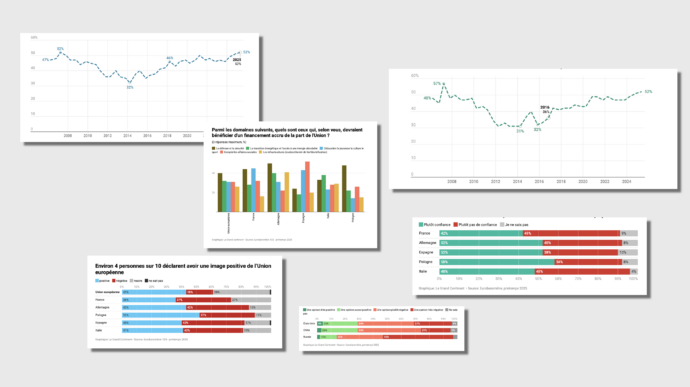 - En France, 42 % des personnes interrogées déclarent avoir confiance dans l’Union, soit une hausse de 7 points par rapport à l’automne 2024. Ce chiffre est de 48 % en Italie (-3), et de 52 % en Allemagne (+3) et en Espagne (+1), et de 58 % en Pologne (-5 %).