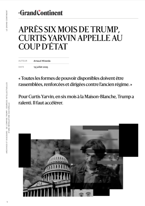Les réflexions de Yarvin relèvent d’une « bloguisation » de la pensée politique — une réduction en formules brèves, polémiques, et facilement partageables d’idées autrement plus complexes — particulièrement bien adaptées aux stratégies de mobilisation virale et de disruption qui contribuèrent à la victoire de Trump en 2016.