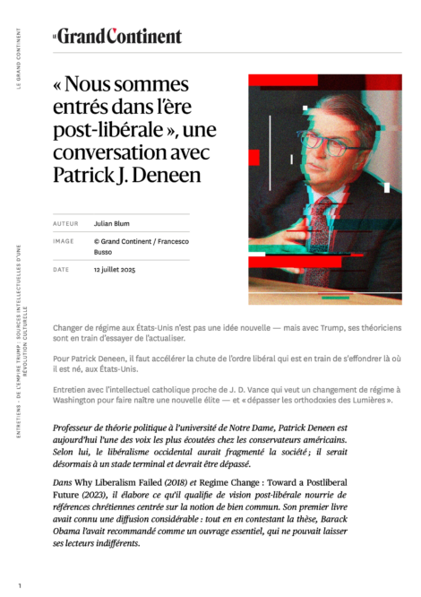 Professeur de théorie politique à l’université de Notre Dame, Deneen est devenu l’un des critiques les plus aigus et articulés des effets de fragmentation sociale et politique engendrés, selon lui, par le libéralisme au cœur de la civilisation occidentale.
