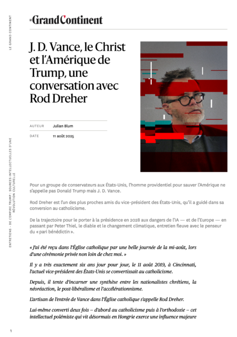 Journaliste américain, ancien collaborateur du Wall Street Journal et aujourd’hui éditorialiste à The American Conservative, Rod Dreher est notamment l’auteur de The Benedict Option, l’une des expressions les plus singulières de la stratégie dite de la « voie de sortie » (exit) — thème majeur de la pensée néo-réactionnaire, comme l’a souligné Curtis Yarvin et dont parle longuement Nick Land.