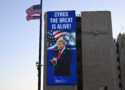 Des drapeaux américains flottent à côté d’un panneau d’affichage avec une photo du président américain Donald Trump sur laquelle on peut lire «  CYRUS LE GRAND EST VIVANT  !  » en l’honneur de son succès dans la fin de la guerre entre Israël et le Hamas, après deux ans, le samedi 11 octobre 2025 à Jérusalem. Cyrus le Grand a libéré les captifs juifs à Babylone et leur a permis de retourner en terre promise. © Debbie Hill/ UPI Photo via Newscom