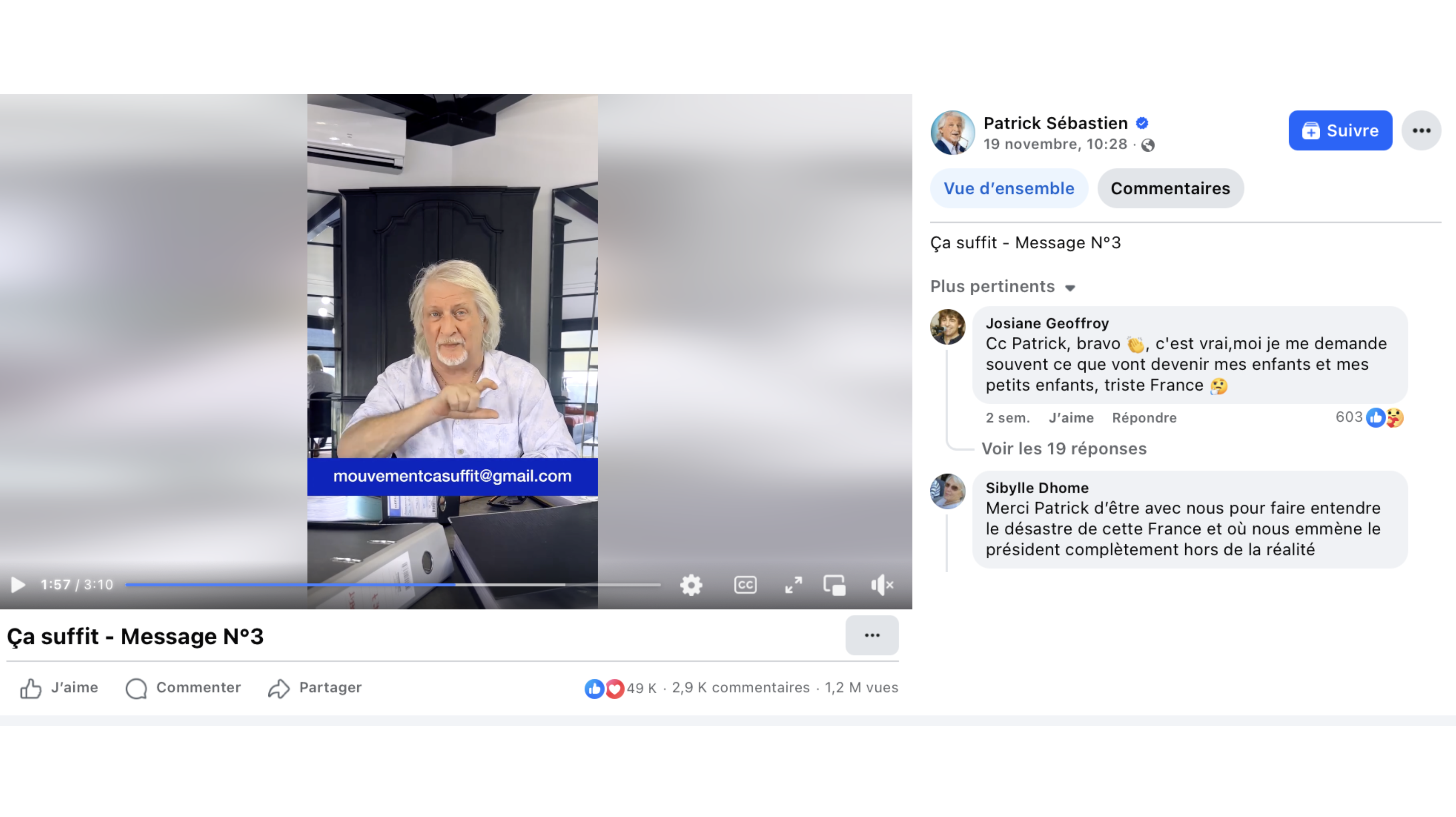 Dans le mouvement de Patrick Sébastien, on ne trouve rien de tout cela : celui-ci se réduit à une adresse mail des plus simples — créable en deux minutes sur Gmail — et une poignée de vidéos mises en ligne sur ses comptes personnels. Il est vrai qu’il dispose d’une puissance de feu non négligeable : 2 millions d’abonnés sur YouTube, 473 000 sur Facebook et près de 250 000 sur X.