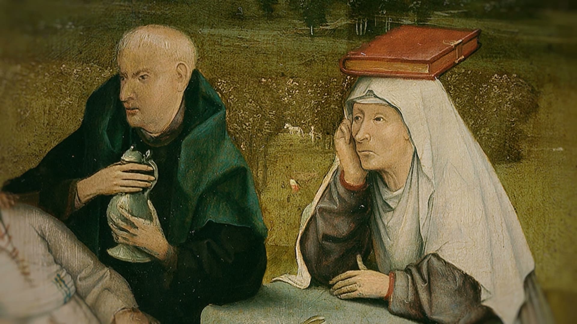 Un moine tonsuré se dresse devant le patient ; vêtu d’une robe de velours noir, il tient dans sa main gauche un pichet en métal tandis que la droite est suspendue près de la tête du patient, comme dans un geste de bénédiction. Dans son dos, une nonne penchée en avant, les deux coudes calés sur une table en pierre finement ciselée, contemple l’homme en train de subir la macabre trépanation avec une expression de dégoût, ; à moins qu’il ne s’agisse d’une simple lassitude, de cette fatigue immense que l’on éprouve devant le non-sens absolu du monde. Sa joue est posée sur la paume de sa main, et un grand livre relié de cuir repose en équilibre précaire sur sa tête, recouverte d’un long voile blanc qui illumine ses traits sévères et lui tombe jusqu’à la taille. La religieuse ne semble pas du tout impressionnée par l’horrible incision que le chirurgien a ménagée dans le crâne du patient — mais n’est-ce pas une tulipe que l’on voit surgir de la plaie toute fraîche ?