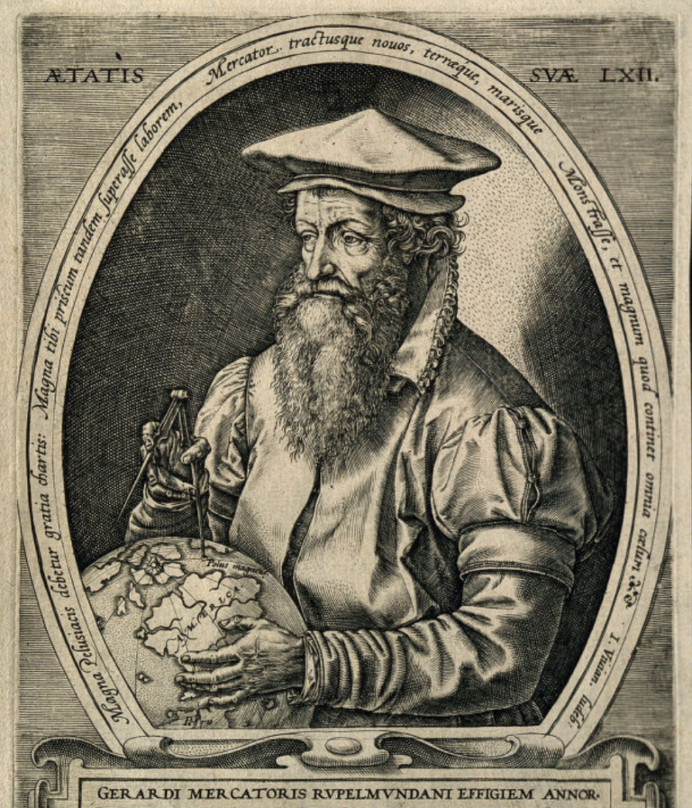 Telle n’était pourtant pas l’intention de son concepteur. Spécialisé dans la fabrication de globes terrestres, le mathématicien et cartographe flamand Gerardus Mercator (1512-1594), profondément marqué par le premier tour du monde de Magellan achevé en 1522, se lança, à partir de 1552, dans l’ambitieux projet de composer une cosmographie historique et géographique complète. Cette entreprise aboutit, en 1569, à la publication de la Nova et aucta orbis terrae descriptio ad usum navigantium, une carte monumentale composée de dix-huit feuilles — près de deux mètres sur un mètre trente — qui réussissait l’exploit de projeter la Terre, de forme sphérique, sur une surface plane.