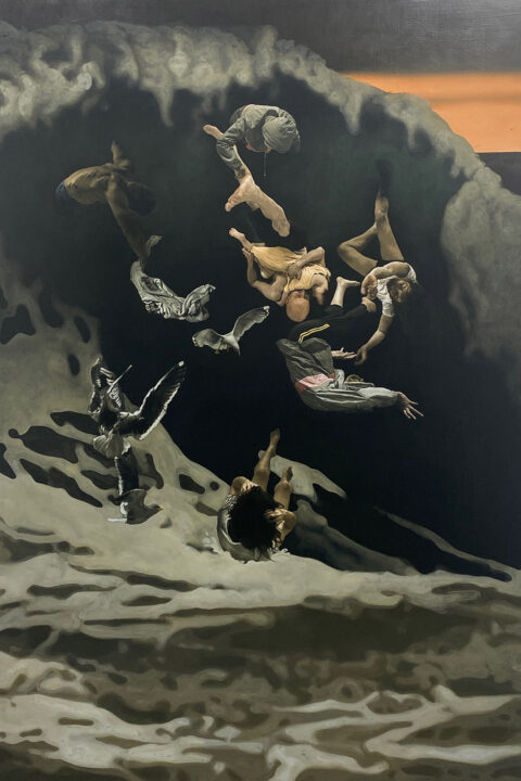 « Sont-ce des anges qui chutent du ciel ? Ou des hommes qui s’effondrent, dansant les désastres du passé ? En s’approchant, on comprend qu’il ne s’agit pas d’un tableau ancien, mais bien d’une image récente de notre condition humaine. Car nous sommes toutes et tous des survivants de la peste noire qui, en cinq ans seulement, de 1347 à 1352, emporta plus de la moitié de la population européenne. »