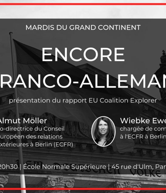 Nous tâcherons de répondre à toutes ces questions mardi 29 janvier à 19h30 en salle des Actes en compagnie d’Almut Möller, co-directrice du Conseil Européen des Relations Extérieures à Berlin, et de Wiebke Ewering chargée de communication à l’ECFR à Berlin, qui ont écrit pour l’occasion à article intitulé « encore le franco-allemand » sur la revue en ligne du Groupe d’Etudes Géopolitiques, Le Grand Continent.