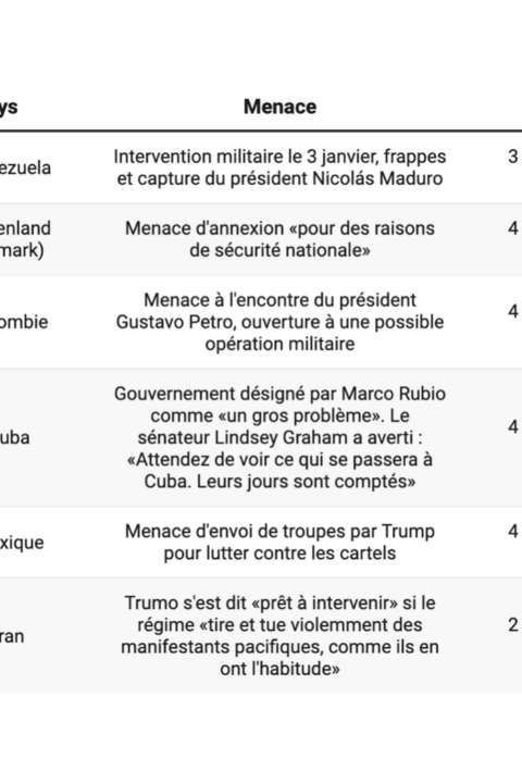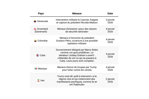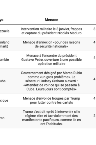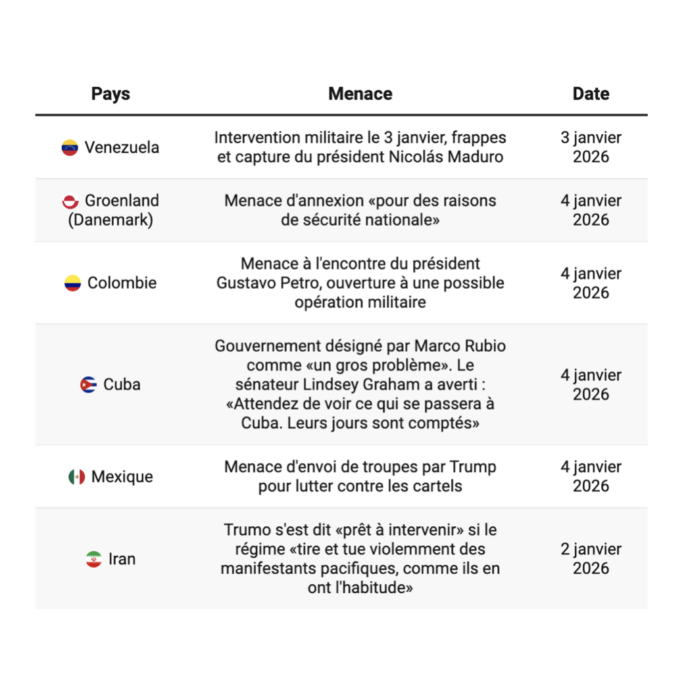 5 janvier 2026 5 janvier 2026 Brèves Guerre Venezuela, Cuba, Groenland… Trump a agi contre ou menacé d’intervention six pays depuis le 1er janvier Guerre