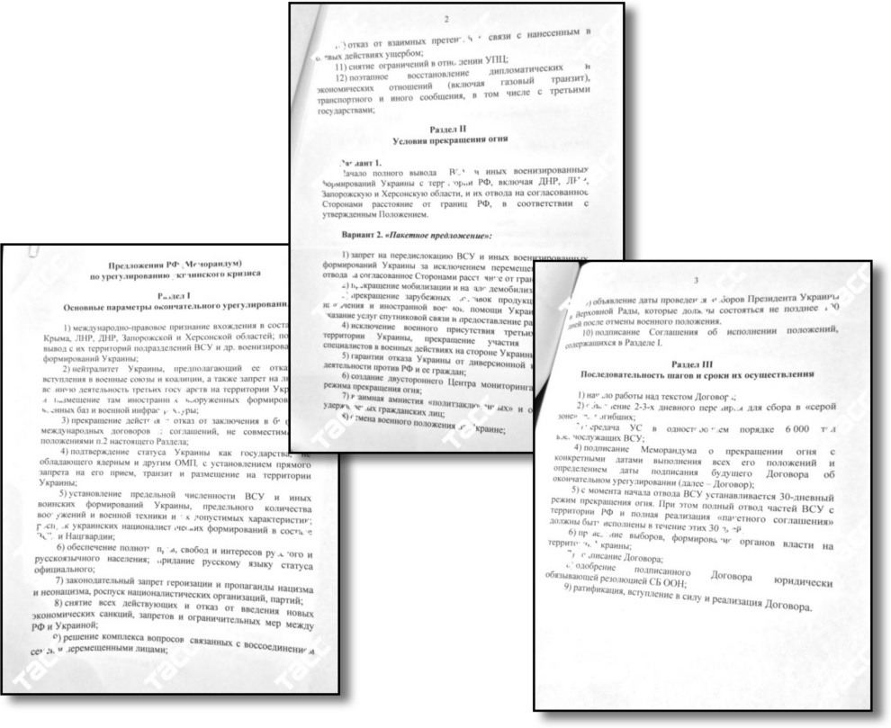 Il documento prevedeva, in particolare, il divieto per l’Ucraina di aderire alla NATO — a cui Kiev si oppone —, nonché una riduzione delle dimensioni dell’esercito ucraino al minimo indispensabile: l’esercito sarebbe stato limitato a 85 000 uomini, contro i 200 000 prima della guerra e il milione attuale, 342 carri armati, 102 velivoli e 519 pezzi di artiglieria.