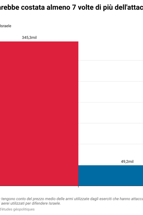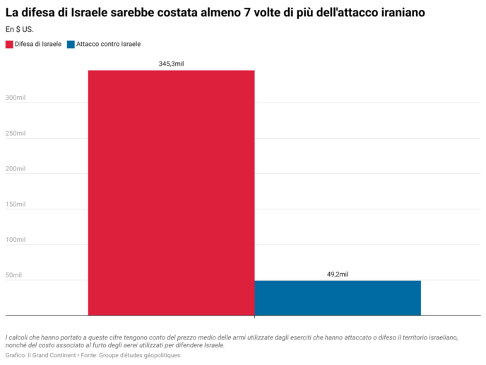 Secondo i calcoli esclusivi del Groupe d'études géopolitiques, l'Iran ha speso circa 49 milioni di dollari per il suo attacco al territorio israeliano. Si tratta di una cifra sette volte inferiore ai 345 milioni spesi da Israele, Stati Uniti, Francia, Regno Unito e Giordania per abbattere i droni e i missili lanciati da Teheran.